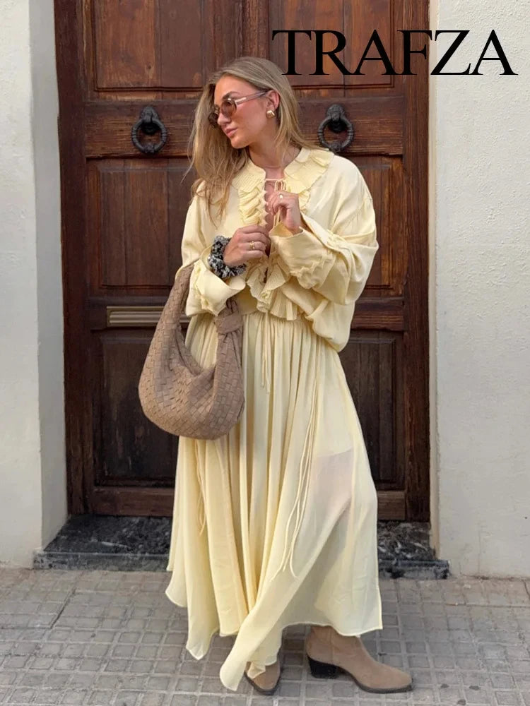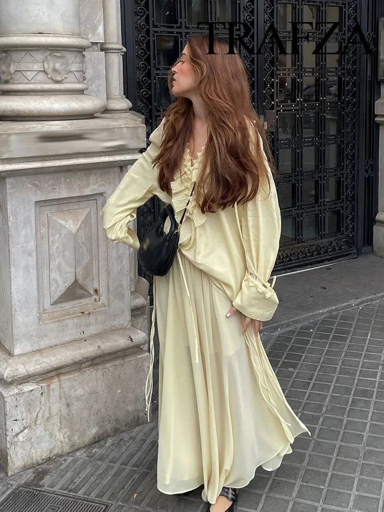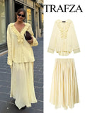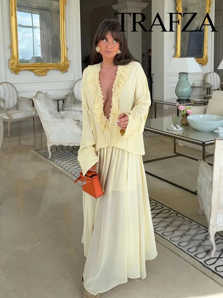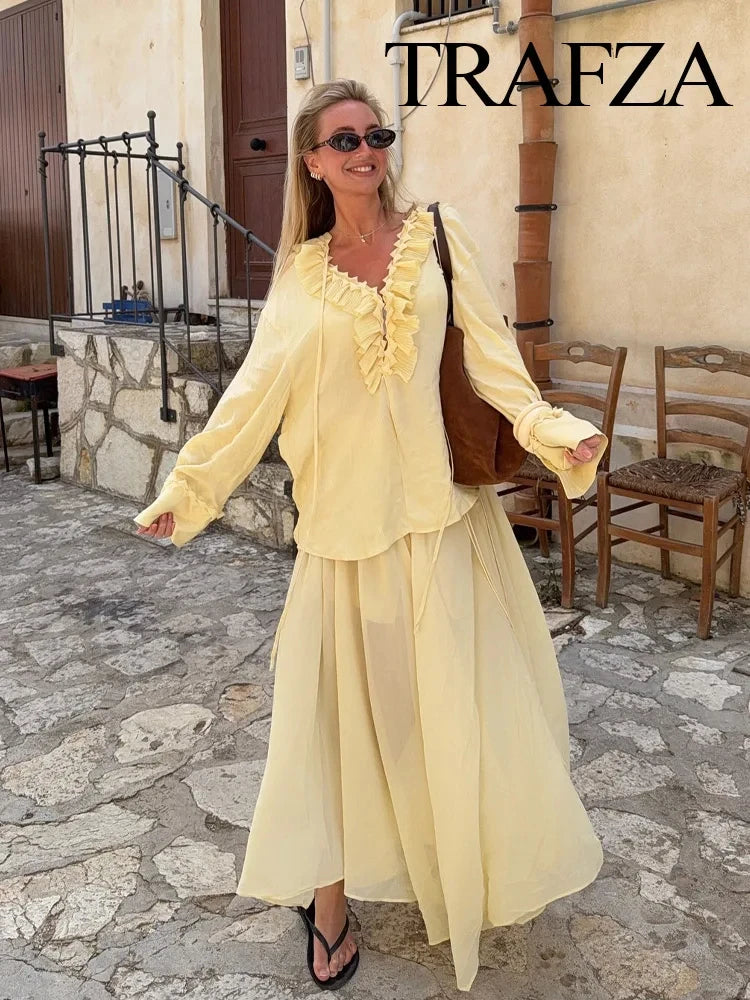 Voel je vrouwelijk en verfijnd in onze Chiffon Set met Hoge Taille en Lange Rok. Deze stijlvolle tweedelige set bestaat uit een lichte top en een vloeiende lange rok met hoge taille, perfect voor zomerse dagen, vakanties of chique gelegenheden.