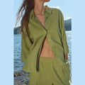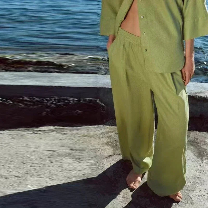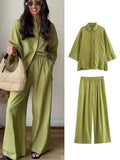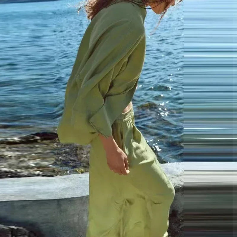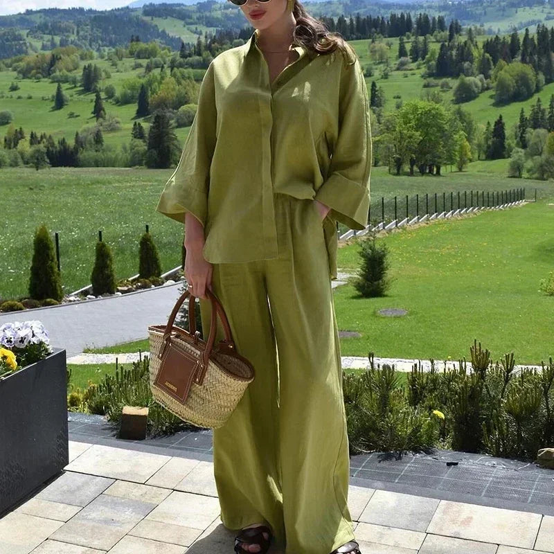 Voeg moeiteloos elegantie en comfort toe aan je garderobe met onze Tweedelige Set voor Dames, bestaande uit een losse lapel shirt top en een high waist broek met wijde pijpen. Deze set combineert een moderne, relaxte pasvorm met een verfijnde uitstraling, perfect voor zowel werk als vrije tijd.